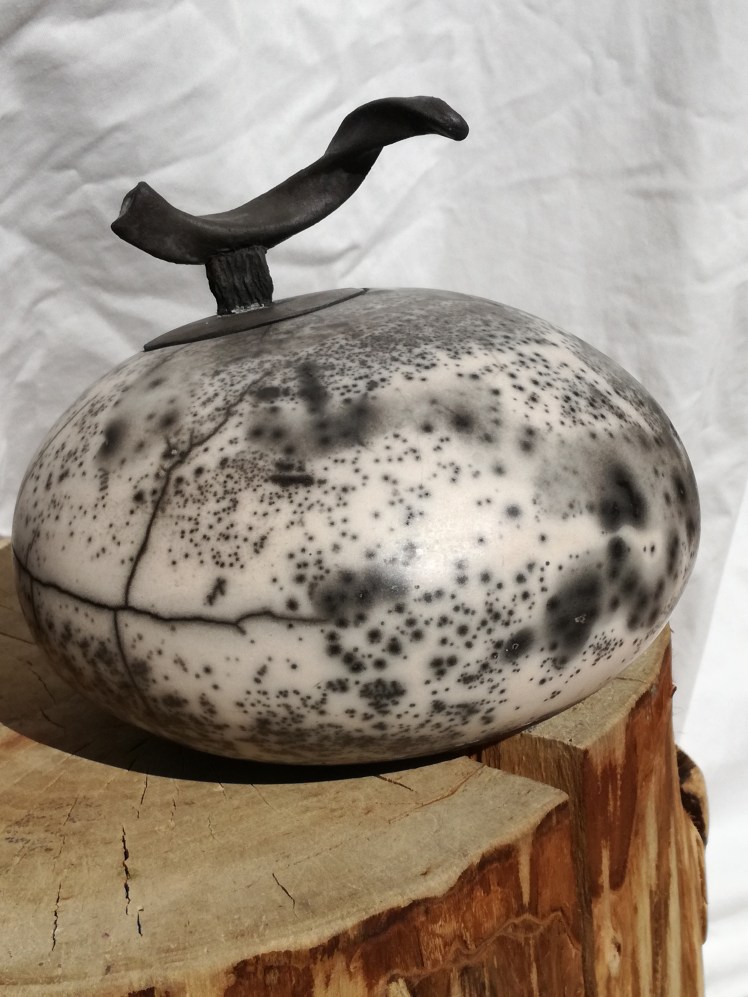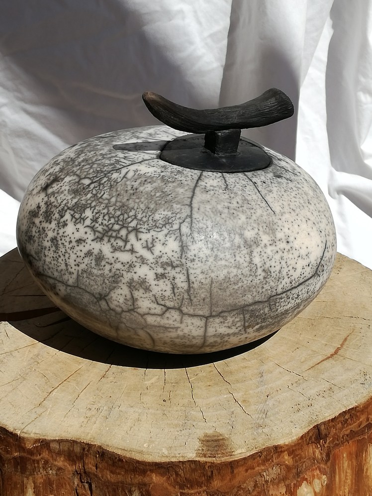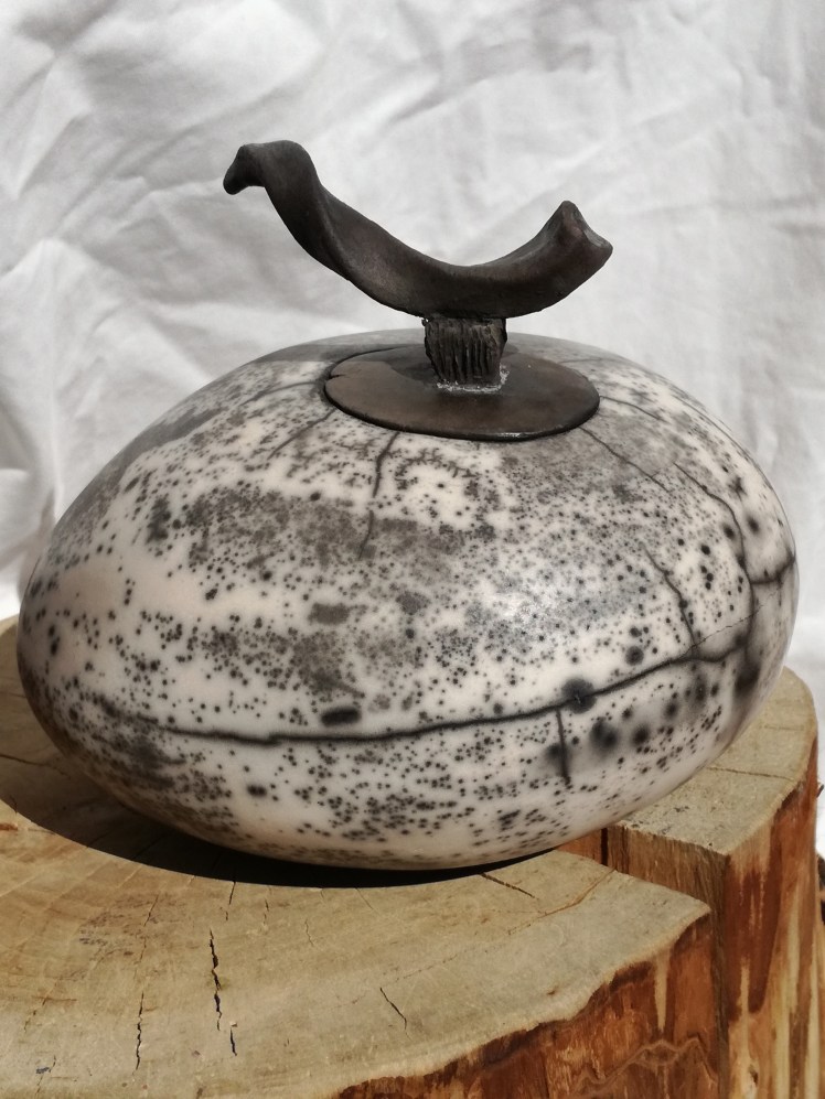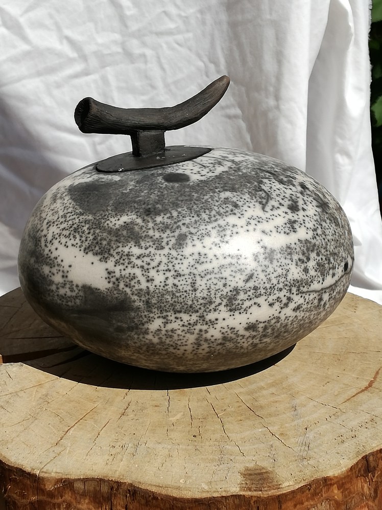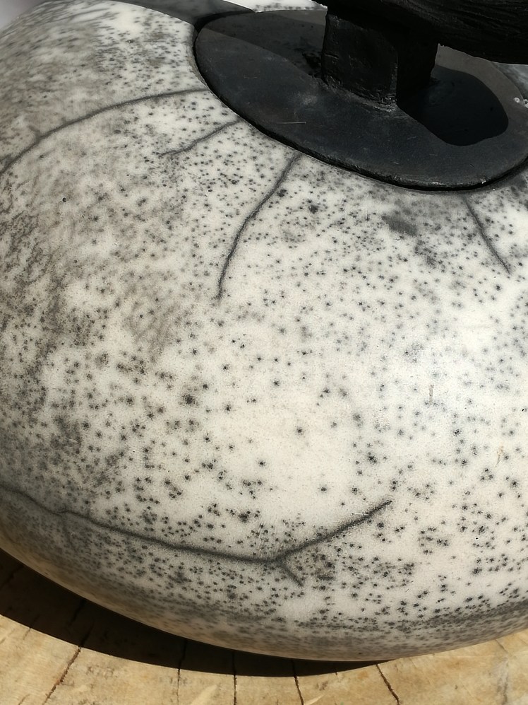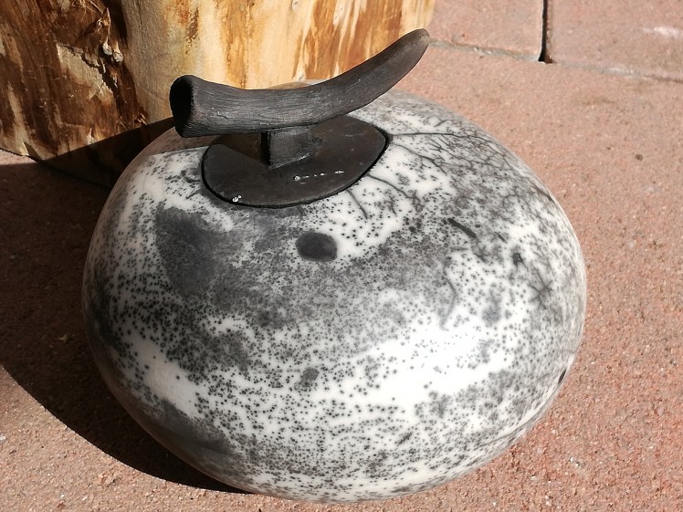 Naked raku is een andere vorm van rakustoken, waarbij je werk uiteindelijk geen glazuur krijgt. Je smeert het werk eerst in met een bepaalde kleislib. Daarover komt een dun glazuur. Tijdens de stook barst de kleislib met het glazuur en komt er vuur en rook van het stoken aan je werk en dat geeft het zwart/witte effect. Hoe dit uitpakt hangt van veel factoren af. Waar ik in ieder geval voor heb gezorgd is dat de keien spiegelglad waren, dat geeft al een mooi effect. Na het schoonmaken zijn de keien van een waslaagje voorzien voor een subtiele glans. De laatste foto’s zijn van een kei die helaas gebarsten is tijdens het stoken. Deze blijft dan ook bij mij wonen (en dat vind ik helemaal niet erg π)