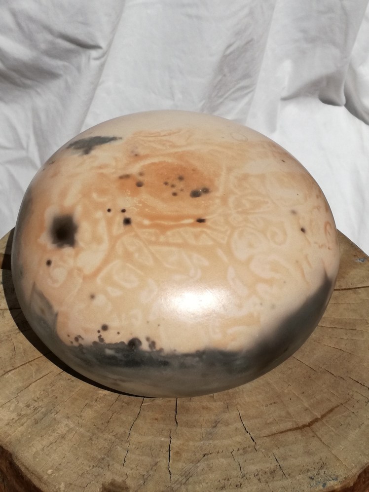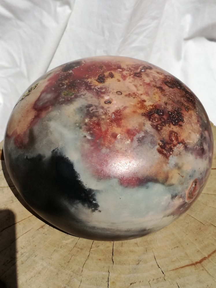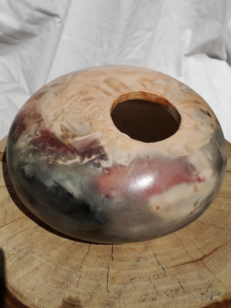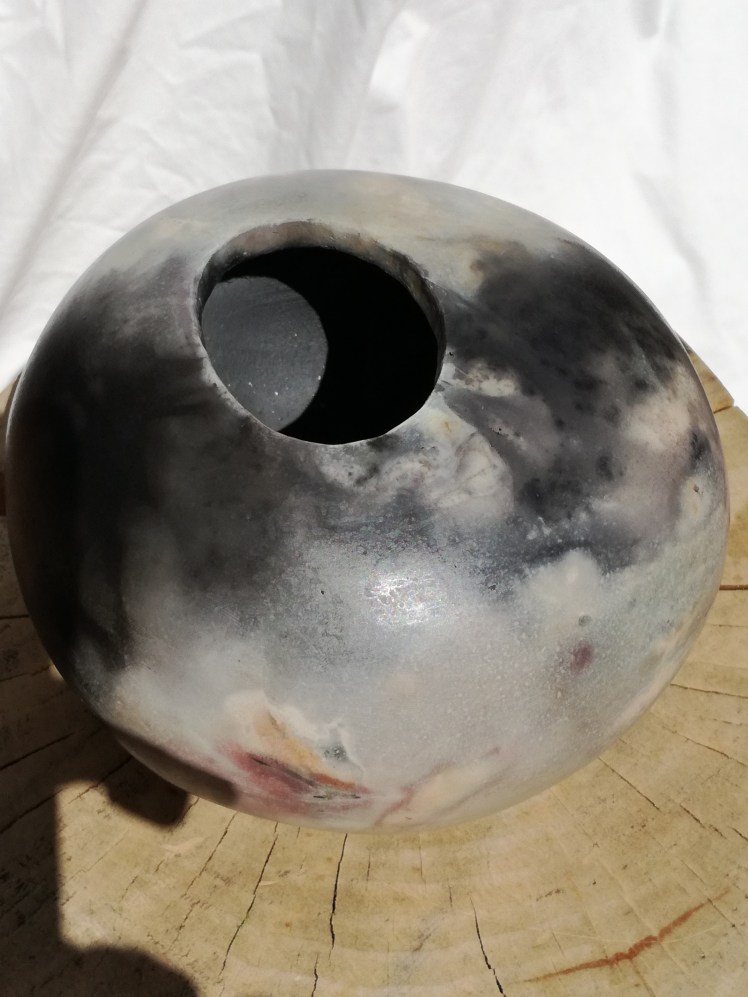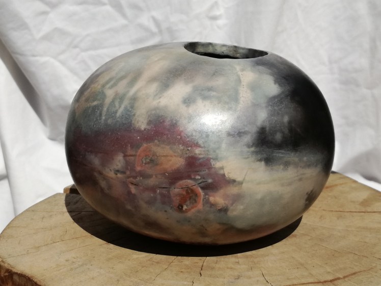 En dan zijn er nog keien die in de pitfire zijn geweest. Hierbij giet je verschillende sulfaten over het werk, in dit geval koper-, ijzer- en cobaltsulfaat. Verder had ik er draad omheen gedraaid om te zien of dit veel effect gaf en heb ik ze in aluminiumfolie ingepakt. Dit hoeft niet, maar heeft een grappig effect gegeven. Toen alles overgoten en ingepakt was, is het in de pit gelegd, waarna er nog wat stoffen bij gegooid zijn, er een lading hout en kranten overheen kwam en de boel in brand gestoken is. En toen was het wachten tot het uitgebrand was en we alles konden schoonboenen. Ook deze potten hebben een waslaagje gekregen. De kleuren zijn heel aards en het heeft wat weg van gesteente. De onderkant van een van de potten lijkt op een stuk uit het heelal! Misschien moet die gewoon ondersteboven door het leven gaan 😊