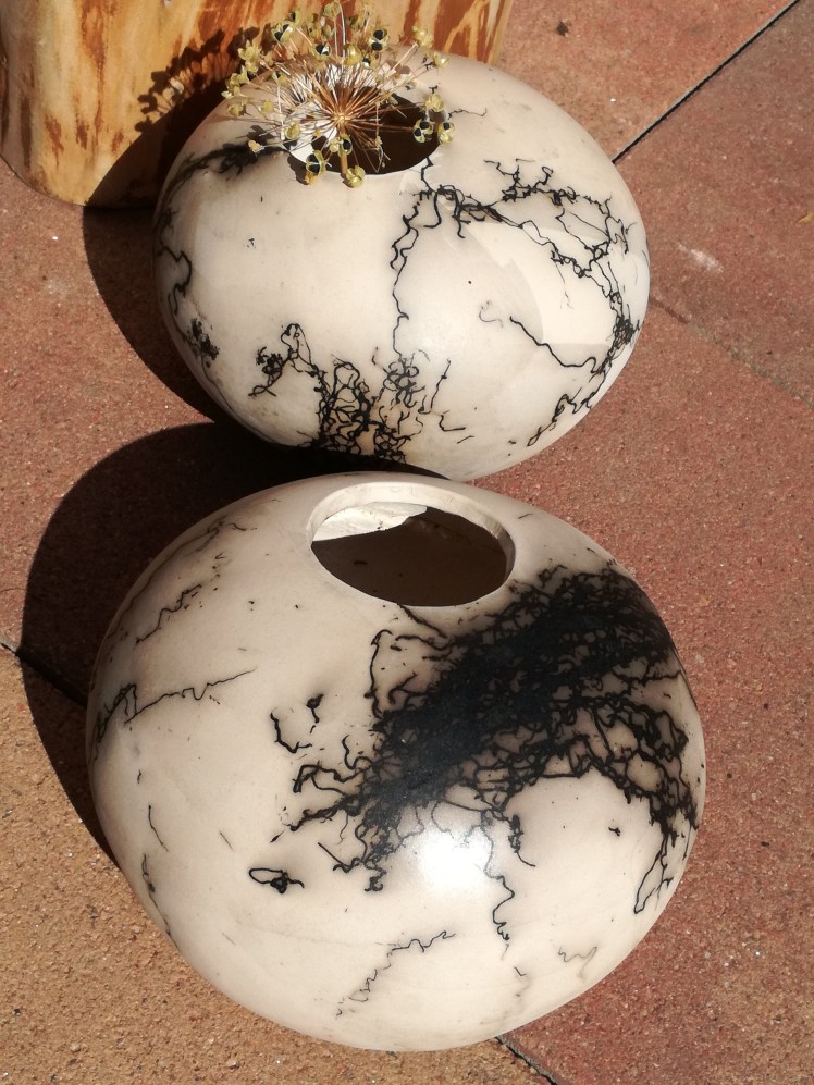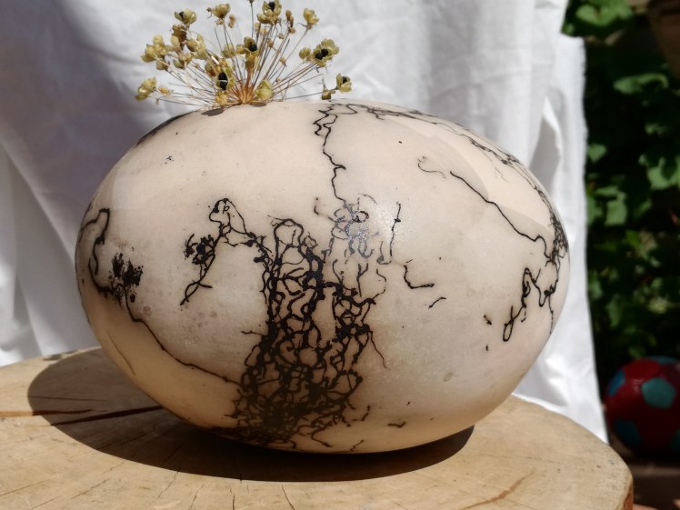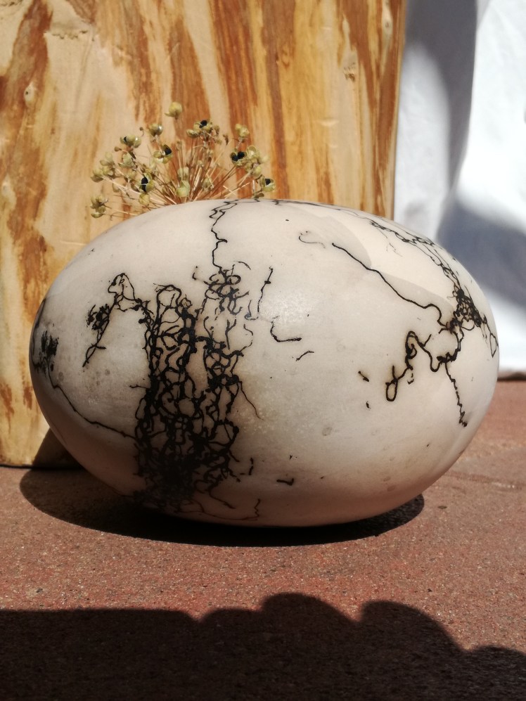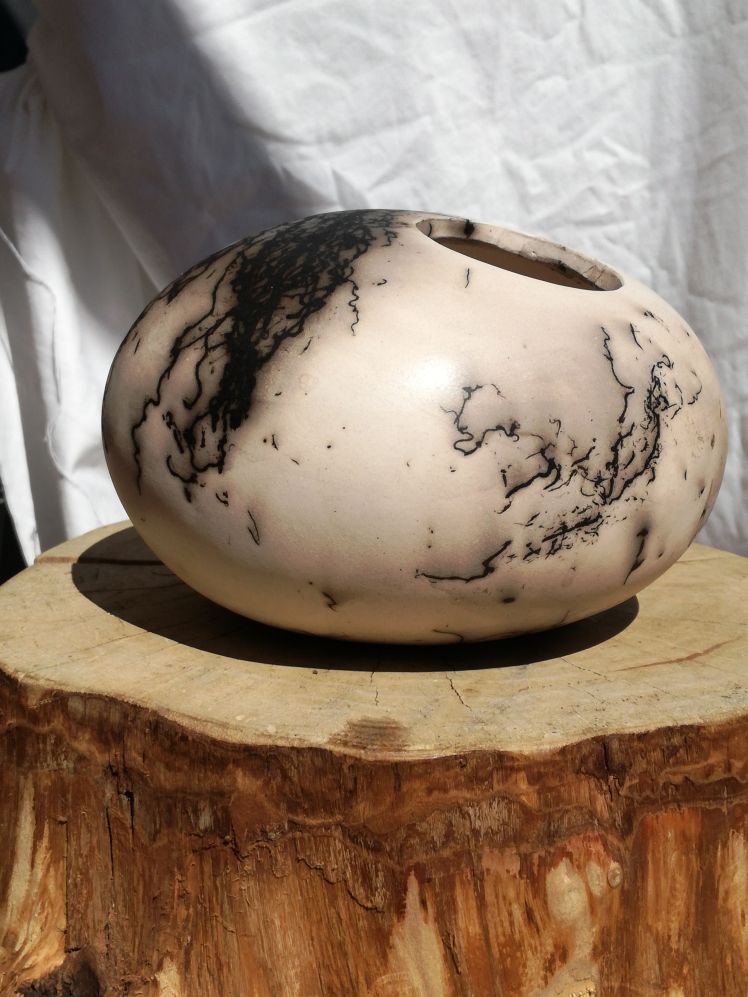 Nog een vorm van rakustoken waarbij het werk geen glazuur krijgt, is het stoken met paardenhaar. De keien zijn in dit geval verhit tot een bepaalde temperatuur en daarna is er paardenhaar tegenaan gehouden. Dit brand dan in het werk in. Als het afgekoeld is poets je het voorzichtig wat schoon en krijgt het werk een waslaagje. Een erg leuk effect. De keien waren echter nog wat warm toen ik het af moest ronden en de was zit er daardoor niet heel netjes op. Als je goed kijkt zie je strepen.
