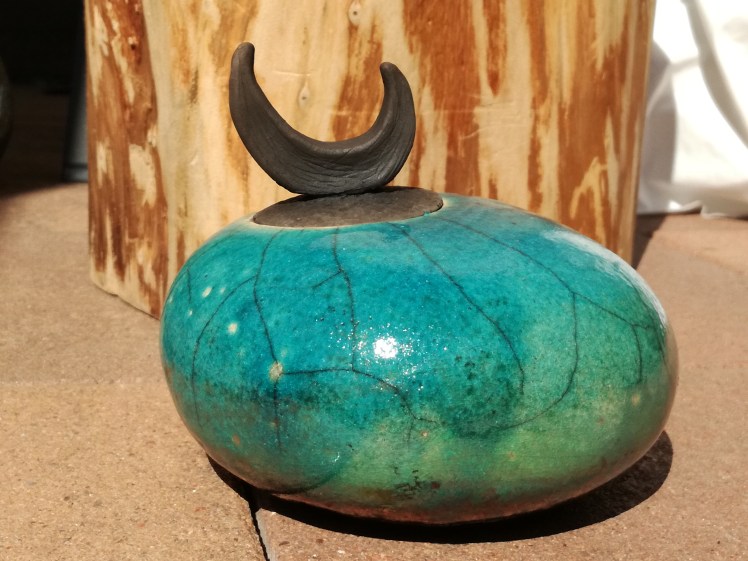 Deze “kei” is handgevormd uit twee halve bollen. Hij is turquoise geglazuurd en tijdens de rakustook is dit heel diep van kleur geworden. Naar beneden toe wordt het wat groener met onderaan koperaccenten. Een heel mooi potje om te zien en te aaien π. Rakuvoorwerpen zijn niet waterdicht, het zijn echt sierobjecten. Maar ze hebben iets magisch en gaan wat mij betreft nooit vervelen.
