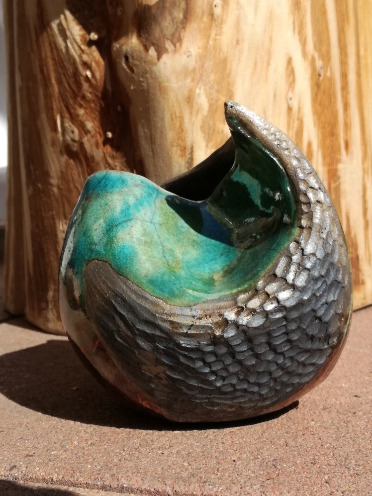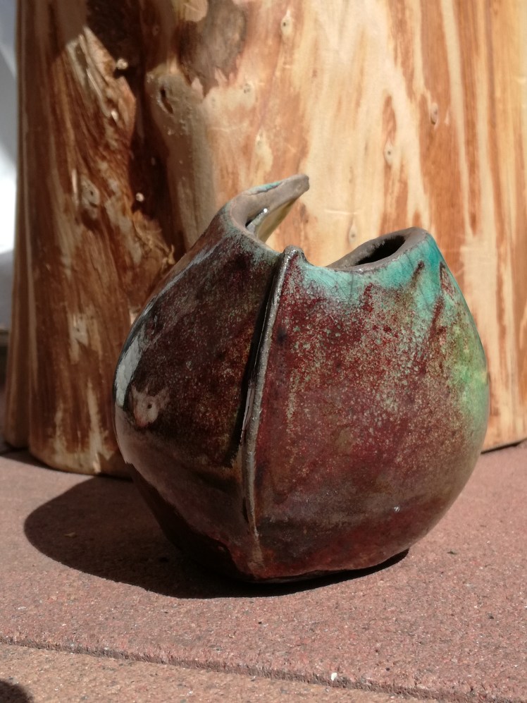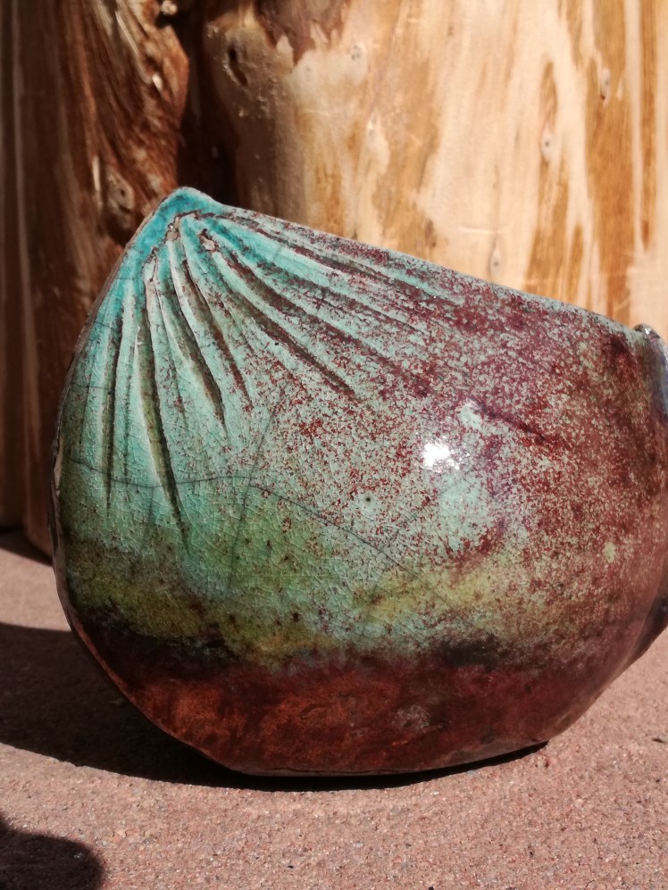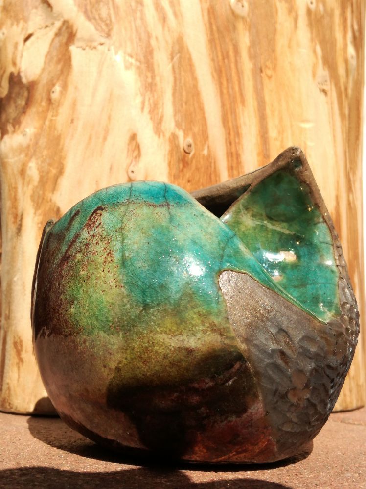 Dit handgevormde potje is ook raku gestookt met een turquoise glazuur. Op plekken waar het niet zit is het zwart. Daar waar het wat weggeveegd is, heeft het zwart een gouden gloed en op andere plekken is het groen, turquoise, roodgespikkeld en koper. Een grappige vorm, waarin droogbloemen een leuk plekje zouden hebben.