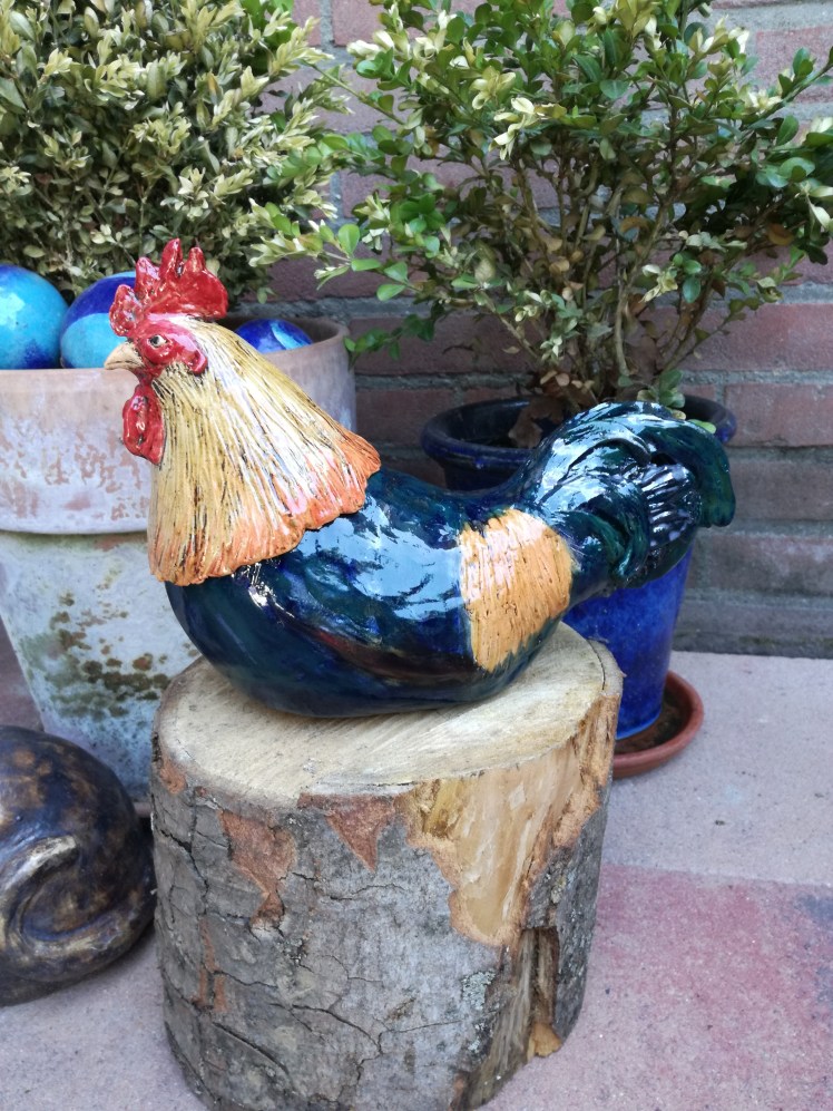 Deze keer een haan die hooggestookt is tot 1200 graden. Daardoor kan deze goed buiten staan in weer en wind. Qua kleur heb ik het eens anders aangepakt en dat geeft leuke effecten en onverwachte nuances 😉.