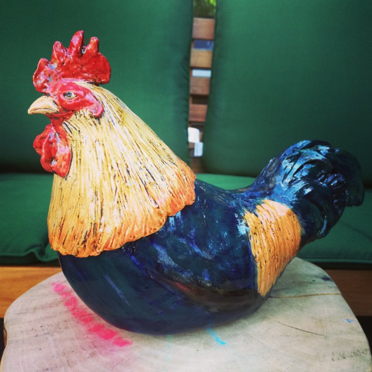 Oorspronkelijk was dit een proefmodelletje voor de zwart-witte haan. Echter viel de kop er te makkelijk af. Nu heb ik hem zo geglazuurd dat de kop vastgebakken is…probleem verholpen!