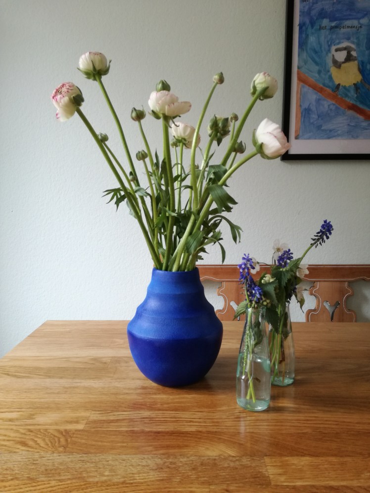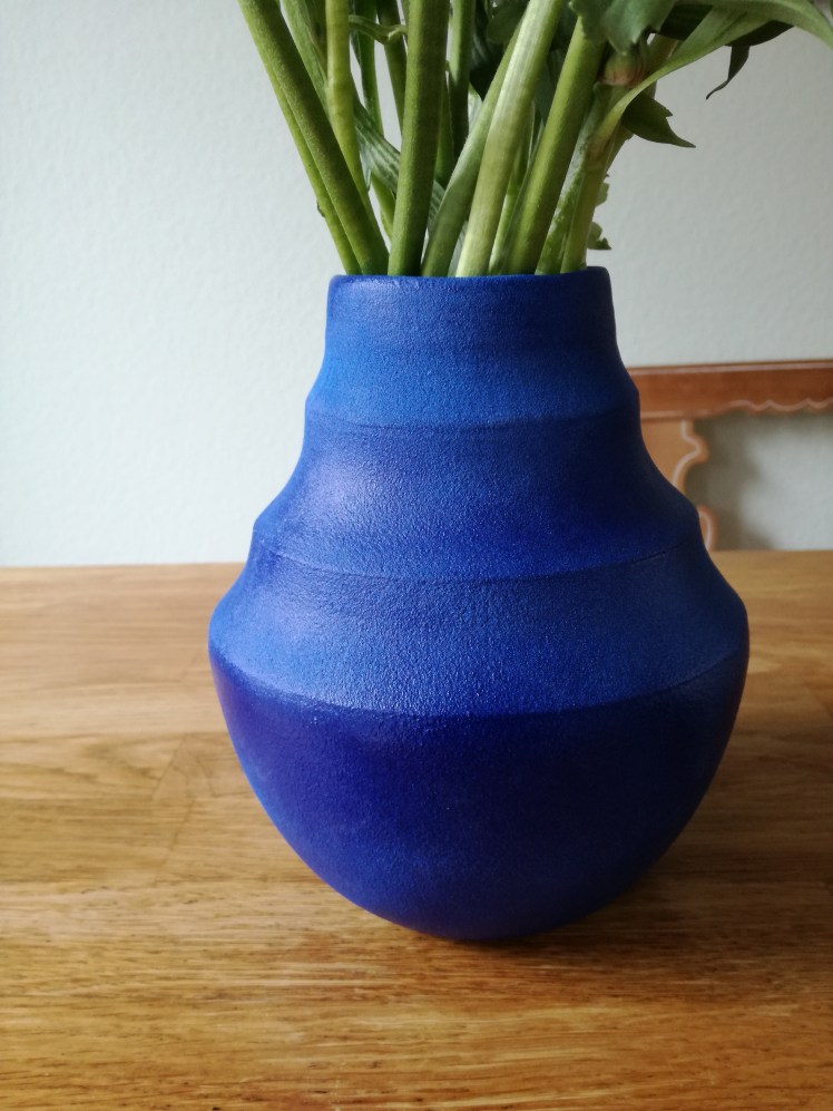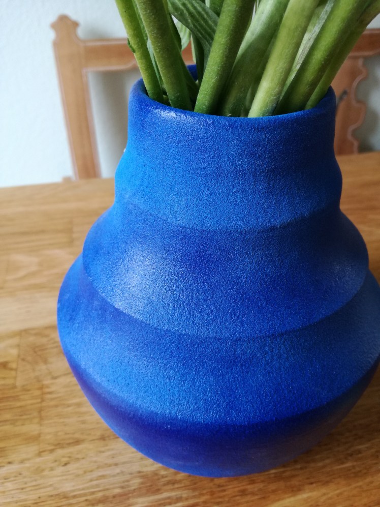 Deze vaas is, zoals de titel al zegt matblauw. En niet zomaar! De kleur is heel intens en doet me denken aan werken van Rothko. Het oppervlak is ruw van structuur en ziet er haast poederachtig uit. Een bijzonder mooi glazuur dus.