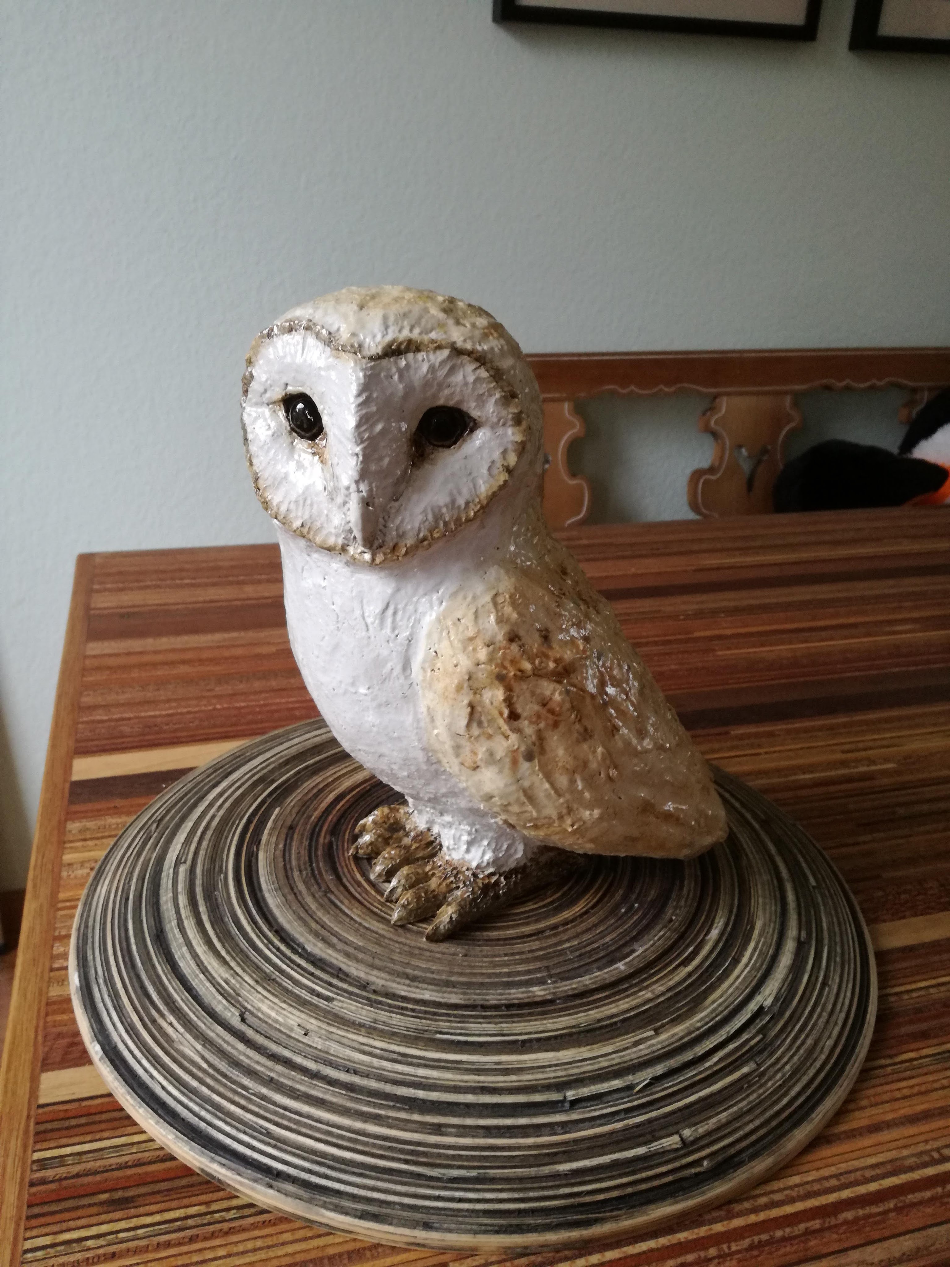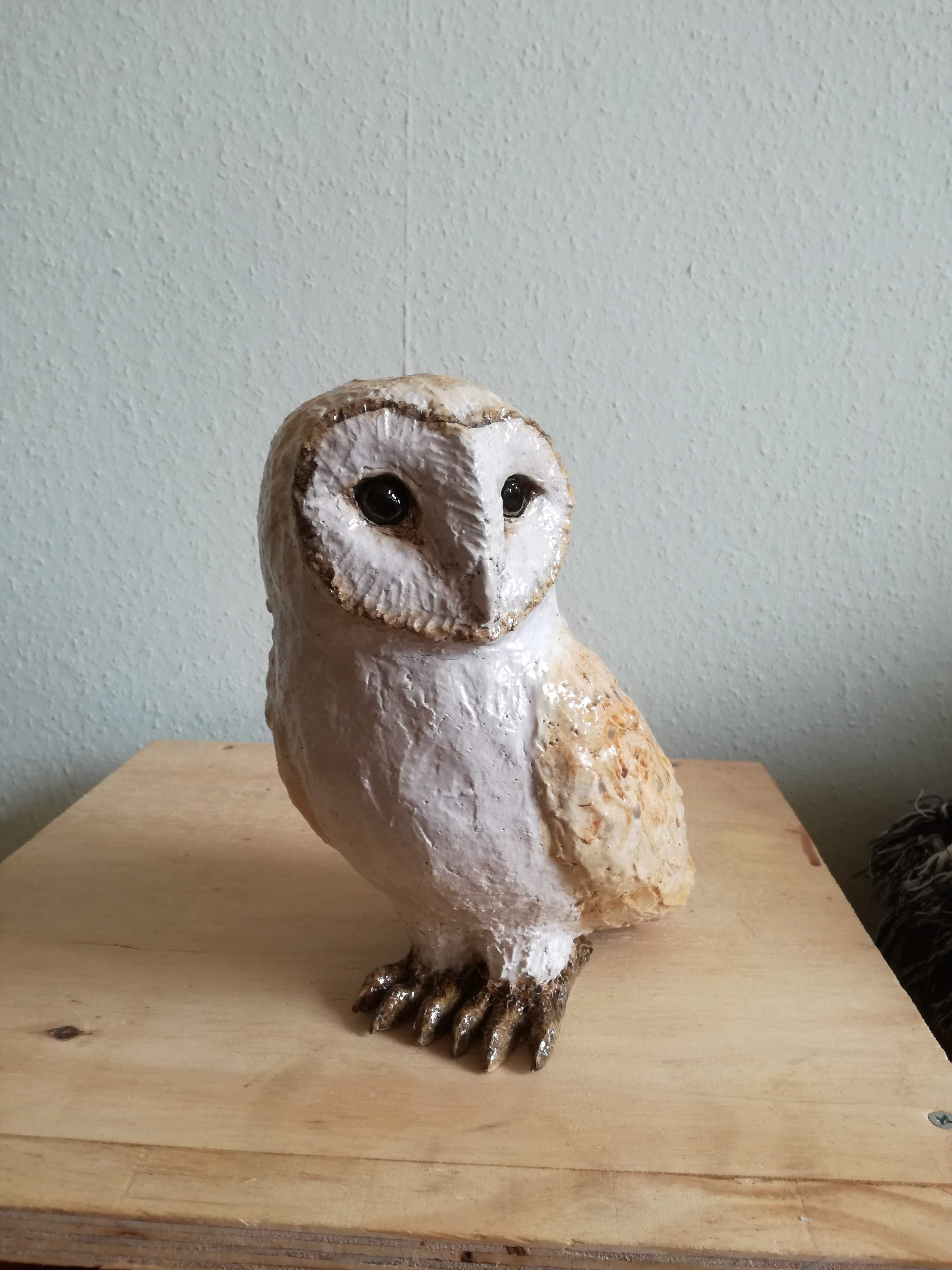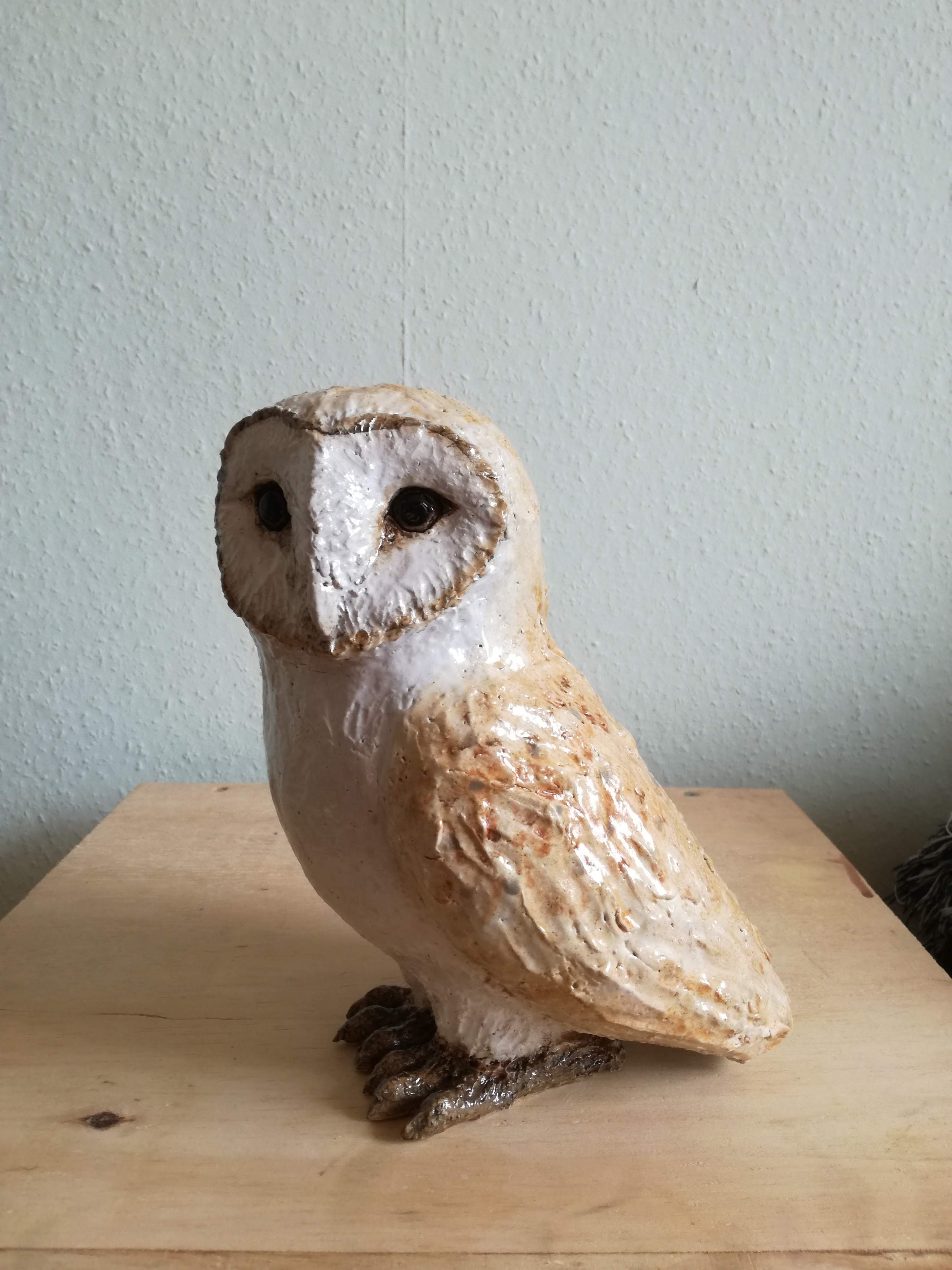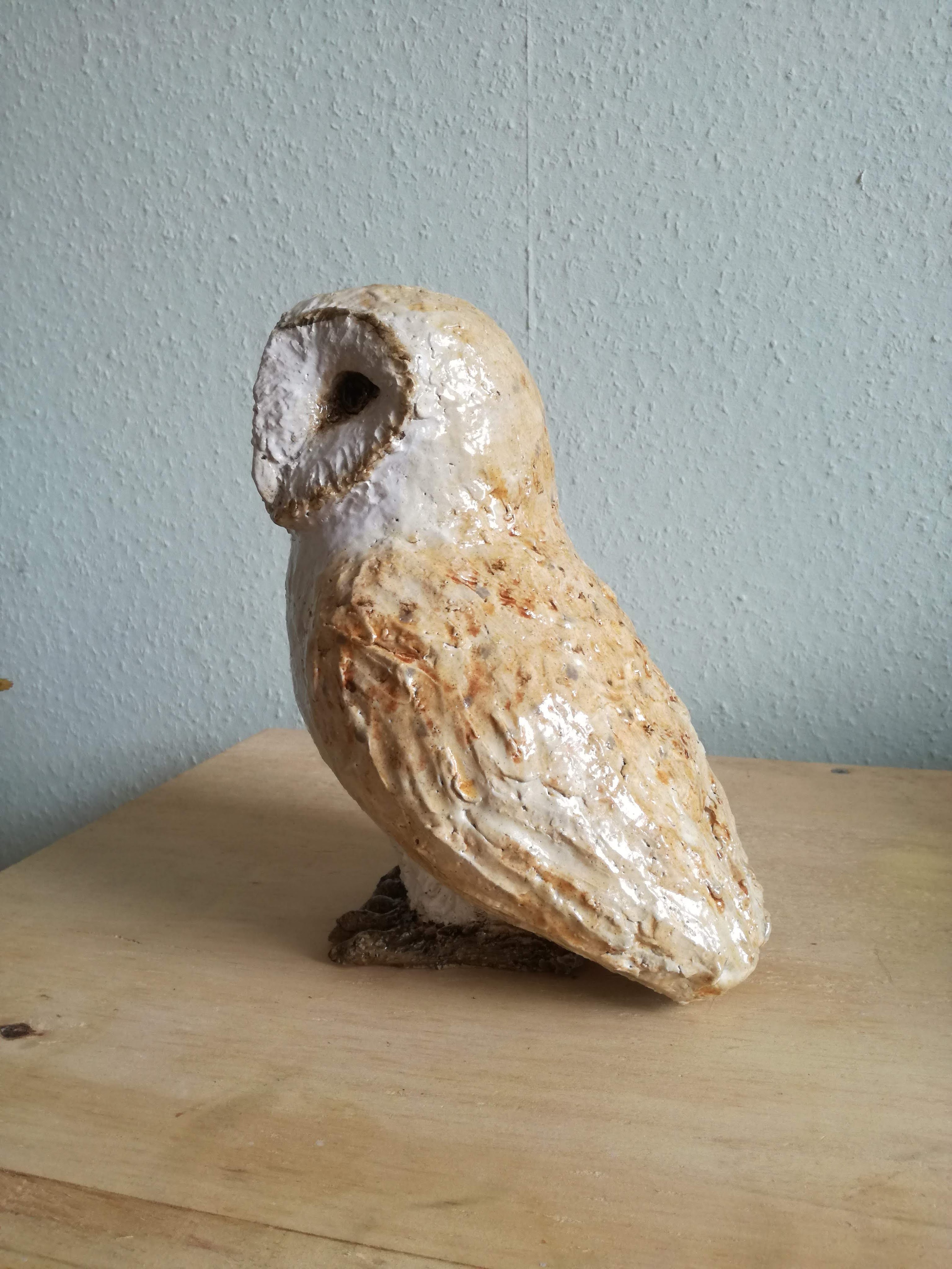 Dierenbeelden vind ik altijd heel leuk, maar ook erg spannend om te maken. Ik volg een Engelse keramist die heel gave beelden maakt en de essentie van een dier zo goed weet vast te leggen. Dat werkt enerzijds inspirerend, maar anderzijds soms ook verlammend. Om een dier goed te “vangen” in keramiek moet je goed observeren en veel oefenen. Maar zeg nou eerlijk, hoe vaak zie ik een kerkuil? Bij mij blijft het dus bij het bekijken van foto’s en uitvissen hoe zo’n vogel gebouwd is en daarna proberen dat in klei te vormen. Als het beeld er dan eenmaal is en de bisquitstook heeft overleefd, volgt de volgende stap van onderzoek. Hoe te glazuren? Met pigmenten en oxides krijg je een mooi mat effect, maar ik heb daar nog niet veel ervaring mee. Met Clay Bright kan ik bijna aquarelleren, maar op hoge temperaturen krijgt dit materiaal een glanzend effect wat ik voor het beeld liever niet wil. Zoeken dus naar de juiste middenweg. Bij deze kerkuil heb ik uiteindelijk toch Clay Bright gekozen, omdat ik dat het beste ken en in de hand heb. Om het een wat mattere uitstraling te geven heeft de uil een laagje mat transparant gekregen en wat glazend transparant bij de ogen. En hoewel er nog genoeg ruimte tot verbetering in zit, ben ik hier op dit moment heel tevreden over π