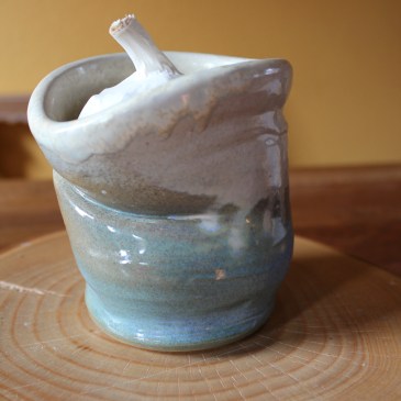 Een schaal van redelijk formaat, met een mat turquoise glazuur. De rand heeft gaten in verschillende grootte, daar is het glazuur met gieten doorheen gegaan wat een speels effect geeft. Op plekken waar het glazuur dik is, is het donkerderblauw tot zwart en op plaatsen waar het licht is, is het uiteraard lichter van kleur.